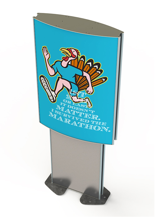 מתקני התצוגה מסדרת PD-D עושים שימוש בשלדה תחתונה הבנויה מפרופילי אלומיניום מסדרת Radius Totem  עם בסיס פלדה צבוע בתנור ובשילוב חלק עליון דו צידי קמור או שטוח בגימור אנודייז כסוף יוקרתי .מתקני התצוגה מסדרה PD-D  מציעים גוף דו צידי להצגת פוסטרים ברוחב שבין 60-80 ס"מ ובגובה כללי של כ 160 ס"מ כך שאינם חוסמים את שדה הראיה במרחב בו הם מוצבים אך עדיין מאפשרים הצגת פוסטרים בגודל גדול יחסית. את מתקני התצוגה מסדרה PD-D ניתן להזמין עם וללא תאורה פנימית וכן עם בסיס להצבה חופשית עם או בלי גלגלים וכן עם בסיסי פלדה לעיגון לקרקע.